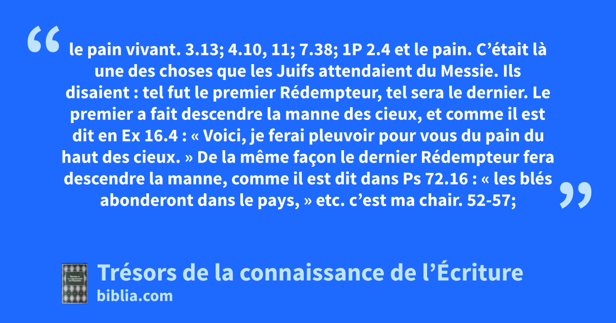 le pain vivant. 3.13; 4.10, 11; 7.38; 1P 2.4 et le pain. C’était là une des choses que les Juifs attendaient du Messie. Ils disaient : tel fut le premier Rédempteur, tel sera le dernier. Le premier a fait descendre la manne des cieux, et comme il est dit en Ex 16.4 : « Voici, je ferai pleuvoir pour vous du pain du haut des cieux. » De la même façon le dernier Rédempteur fera descendre la manne, comme il est dit dans Ps 72.16 : « les blés abonderont dans le pays, » etc. c’est ma chair. 52-57; Mt 20.28; Lc 22.19; Ep 5.2, 25; Tt 2.14; Hé 10.5-12, 20 pour la vie. 33; 1.29; 3.16; 2Co 5.19, 21; 1Jn 2.2; 4.14