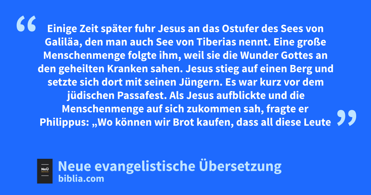 6 1 Einige Zeit später fuhr Jesus an das Ostufer des Sees von Galiläa, den man auch See von Tiberias* nennt. 2 Eine große Menschenmenge folgte ihm, weil sie die Wunder Gottes an den geheilten Kranken sahen. 3 Jesus stieg auf einen Berg und setzte sich dort mit seinen Jüngern. 4 Es war kurz vor dem jüdischen Passafest.