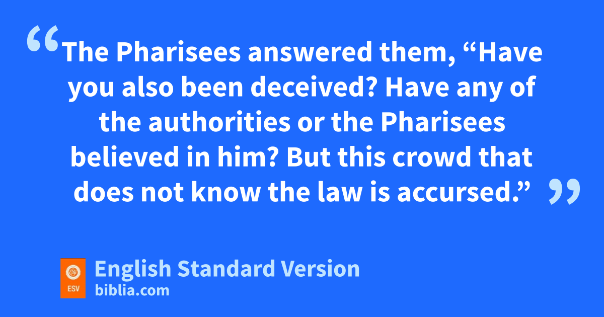 45 sThe officers then came to the chief priests and Pharisees, who said to them, “Why did you not bring him?” 46 The officers answered, t“No one ever spoke like this man!” 47 The Pharisees answered them, u“Have you also been deceived? 48 vHave any of the authorities or the Pharisees believed in him? 49 But this crowd that does not know the law is accursed.” 50 wNicodemus, who had gone to him before, and who was one of them, said to them, 51 x“Does our law judge a man without first ygiving him a hearing and learning what he does?” 52 They replied, z“Are you from Galilee too? Search and see that ano prophet arises from Galilee.”