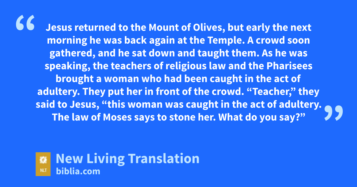Jesus returned to the Mount of Olives, 2 but early the next morning he was back again at the Temple. A crowd soon gathered, and he sat down and taught them. 3 As he was speaking, the teachers of religious law and the Pharisees brought a woman who had been caught in the act of adultery. They put her in front of the crowd.