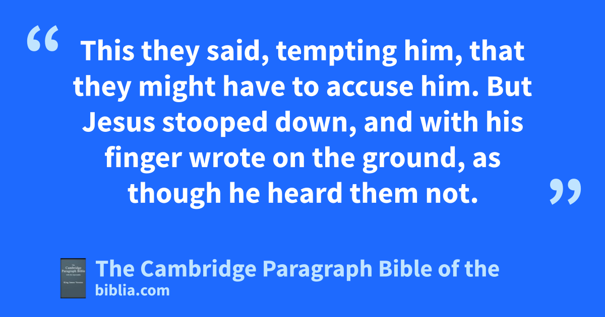 VIII. Jesus went abunto the mount of Olives. 2 And bearly in the morning he came again bcinto the temple, and all the people came unto him; and che sat down, and taught them. 3 And the scribes and Pharisees brought unto him a woman taken in adultery; and when they had set her in the midst, 4 they say unto him, Master, this woman was taken in adultery, in the very act. 5 Now dMoses in the law commanded us, that such eshould be stoned: but what sayest thou? 6 This they said, ftempting him, gthat they might have to accuse him. But Jesus stooped down, and with his finger hwrote on the ground, as though he heard them not. 7 So when they continued asking him, he ilift up himself, and said unto them, kHe that is without sin among you, llet him first cast a stone at her. 8 And again he stooped down, and hwrote on the ground. 9 And they which heard it, mbeing convicted nby their own conscience, went out oone by one, beginning at the eldest, even unto the last: and Jesus was left alone, and the woman standing in the midst. 10 When Jesus had ilift up himself, and saw none but the woman, he said unto her, Woman, where are those thine accusers? hath no man condemned thee? 11 She said, No man, Lord. And Jesus said unto her, pNeither do I condemn thee: go, and qsin no more.