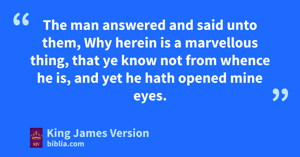 13 They brought to the Pharisees him that aforetime was blind. 14 And nit was the sabbath day when Jesus made the clay, and opened his eyes. 15 Then oagain the Pharisees also asked him how he had received his sight. He said unto them, He put clay upon mine eyes, and I washed, and do see. 16 Therefore said some of the Pharisees, This man is not pof God, qbecause he keepeth not the sabbath day. rOthers said, sHow can a man that is a sinner do such miracles? And tthere was a division among them. 17 They say unto the blind man again, What sayest thou of him, that he hath opened thine eyes? He said, He is ua prophet. 18 But xthe Jews did not believe concerning him, that he had been blind, and received his sight, until they called the parents of him that had received his sight. 19 And they asked them, saying, Is this your son, who ye say was born blind? how then doth he now see? 20 His parents answered them and said, We know that this is our son, and that he was born blind: 21 But by what means he now seeth, we know not; or who hath opened his eyes, we know not: he is of age; ask him: he shall speak for himself. 22 These words spake his parents, because ythey feared xthe Jews: for zthe Jews had agreed already, that if any man did confess that he was Christ, ahe should be put out of the synagogue. 23 Therefore said his parents, He is of age; ask him. 24 Then again called they the man that was blind, and said unto him, bGive God the praise: we know that this man is ca sinner. 25 He answered and said, Whether he be a sinner or no, I know not: one thing I know, that, whereas I was blind, now I see. 26 Then said they to him again, What did he to thee? how opened he thine eyes? 27 He answered them, I have told you already, and ye did not dhear: wherefore would ye hear it again? will ye also be his disciples? 28 Then they reviled him, and said, Thou art his disciple; but we are Moses’ disciples. 29 We know that God spake unto Moses: as for this fellow, ewe know not from whence he is. 30 The man answered and said unto them, fWhy herein is a marvellous thing, that ye know not from whence he is, and yet he hath opened mine eyes. 31 Now we know that gGod heareth not sinners: but if any man be a worshipper of God, and doeth his will, hhim he heareth. 32 iSince the world began was it not heard that any man opened the eyes of one that was born blind. 33 kIf this man were not lof God, he could do nothing. 34 They answered and said unto him, Thou wast maltogether born in sins, and dost thou teach us? And they ||ncast him out. 35 Jesus heard that they had ncast him out; and when he had found him, he said unto him, Dost thou obelieve on pthe Son of God? 36 He answered and said, Who is he, Lord, that I might believe on him? 37 And Jesus said unto him, qThou hast both seen him, and rit is he that talketh with thee. 38 And he said, Lord, I believe. And he sworshipped him.