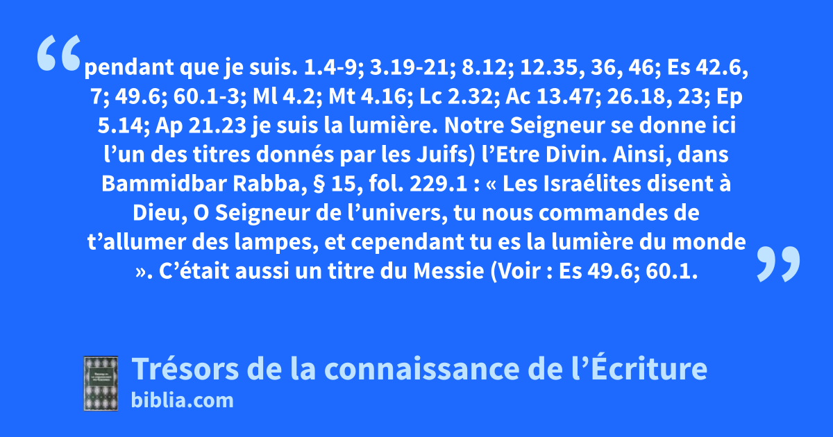 pendant que je suis. 1.4-9; 3.19-21; 8.12; 12.35, 36, 46; Es 42.6, 7; 49.6; 60.1-3; Ml 4.2; Mt 4.16; Lc 2.32; Ac 13.47; 26.18, 23; Ep 5.14; Ap 21.23 je suis la lumière. Notre Seigneur se donne ici l’un des titres donnés par les Juifs) l’Etre Divin. Ainsi, dans Bammidbar Rabba, § 15, fol. 229.1 : « Les Israélites disent à Dieu, O Seigneur de l’univers, tu nous commandes de t’allumer des lampes, et cependant tu es la lumière du monde ». C’était aussi un titre du Messie (Voir : Es 49.6; 60.1.