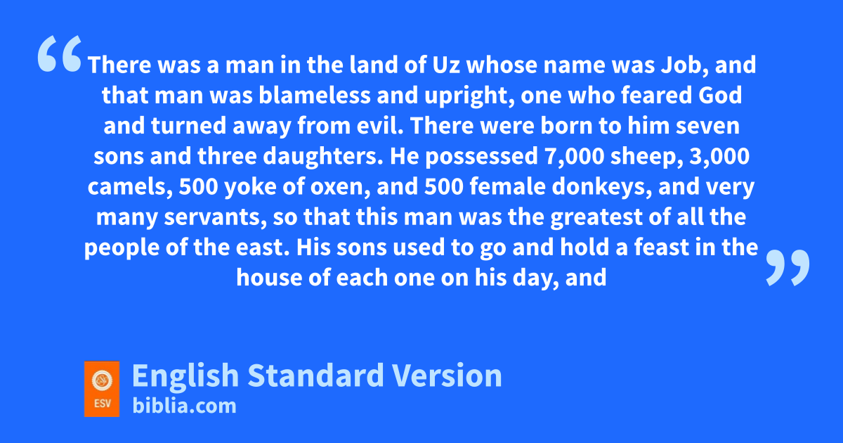 1 There was a man in the land of aUz whose name was bJob, and that man was cblameless and upright, one who dfeared God and eturned away from evil. 2 There were born to him fseven sons and three daughters. 3 He possessed 7,000 sheep, 3,000 camels, 500 yoke of oxen, and 500 female donkeys, and very many servants, so that this man was the greatest of all gthe people of the east. 4 His sons used to go and hold a feast in the house of each one on his day, and they would send and invite their three sisters to eat and drink with them. 5 And when the days of the feast had run their course, Job would send and hconsecrate them, and he would rise early in the morning and ioffer burnt offerings according to the number of them all. For Job said, “It may be that my children have sinned, and jcursed1 God in their hearts.” Thus Job did continually.