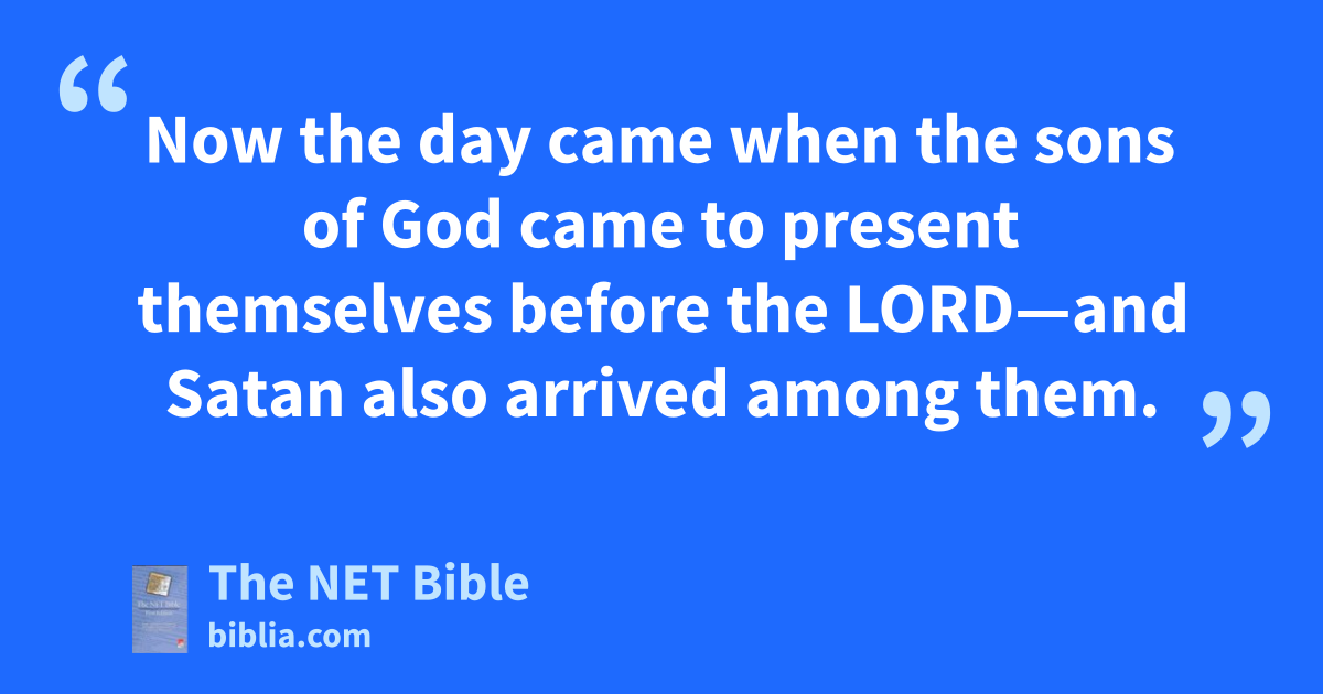 1:6 Now the day came when32 the sons of God33 came to present themselves before34 the Lord—and Satan35 also arrived among them. 1:7 The Lord said to Satan, “Where have you come from?”36 And Satan answered the Lord,37 “From roving about38 on the earth, and from walking back and forth across it.”39 1:8 So the Lord said to Satan, “Have you considered40 my servant Job? There41 is no one like him on the earth, a pure and upright man, one who fears God and turns away42 from evil.”