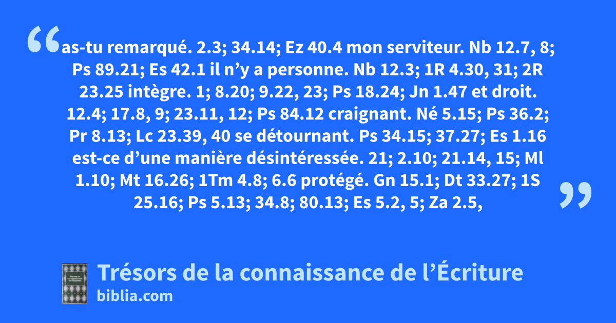 as-tu remarqué. 2.3; 34.14; Ez 40.4 mon serviteur. Nb 12.7, 8; Ps 89.21; Es 42.1 il n’y a personne. Nb 12.3; 1R 4.30, 31; 2R 23.25 intègre. 1; 8.20; 9.22, 23; Ps 18.24; Jn 1.47 et droit. 12.4; 17.8, 9; 23.11, 12; Ps 84.12 craignant. Né 5.15; Ps 36.2; Pr 8.13; Lc 23.39, 40 se détournant. Ps 34.15; 37.27; Es 1.16
