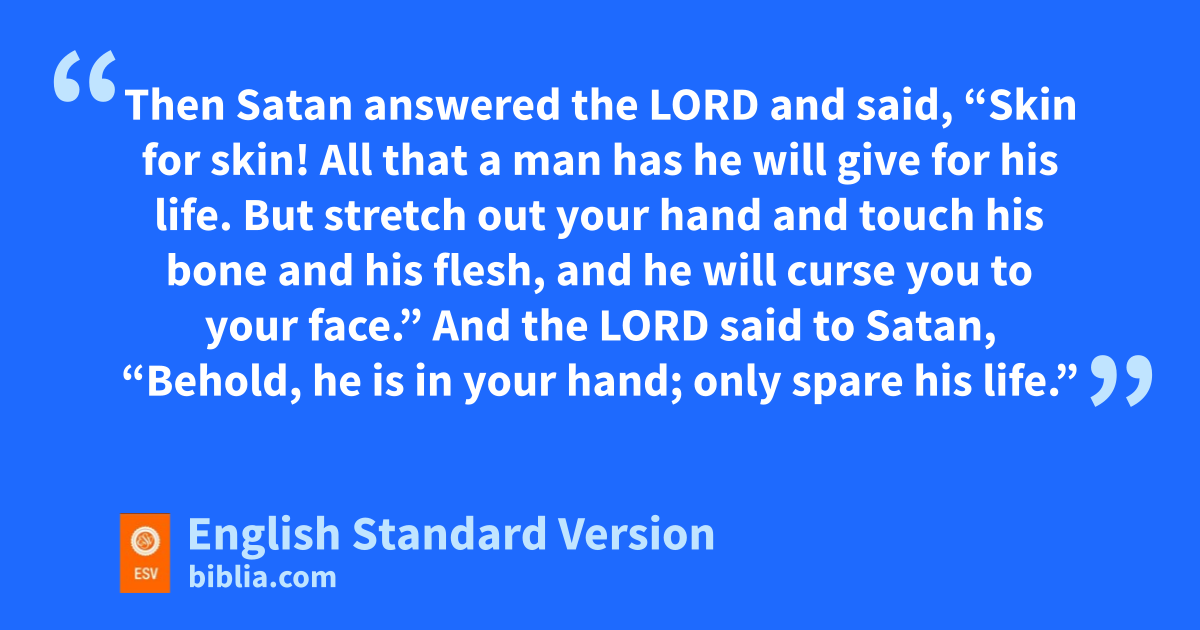 2 Again mthere was a day when the sons of God came to present themselves before the Lord, and Satan also came among them to present himself before the Lord. 2 And the Lord said to Satan, “From where have you come?” Satan answered the Lord and said, “From going to and fro on the earth, and from walking up and down on it.” 3 And the Lord said to Satan, “Have you considered my servant Job, that there is none like him on the earth, a blameless and upright man, who fears God and turns away from evil? He still nholds fast his integrity, although you incited me against him to destroy him owithout reason.” 4 Then Satan answered the Lord and said, “Skin for skin! All that a man has he will give for his life. 5 But pstretch out your hand and touch his bone and his flesh, and he will qcurse you to your face.” 6 And the Lord said to Satan, “Behold, he is in your hand; only spare his life.”