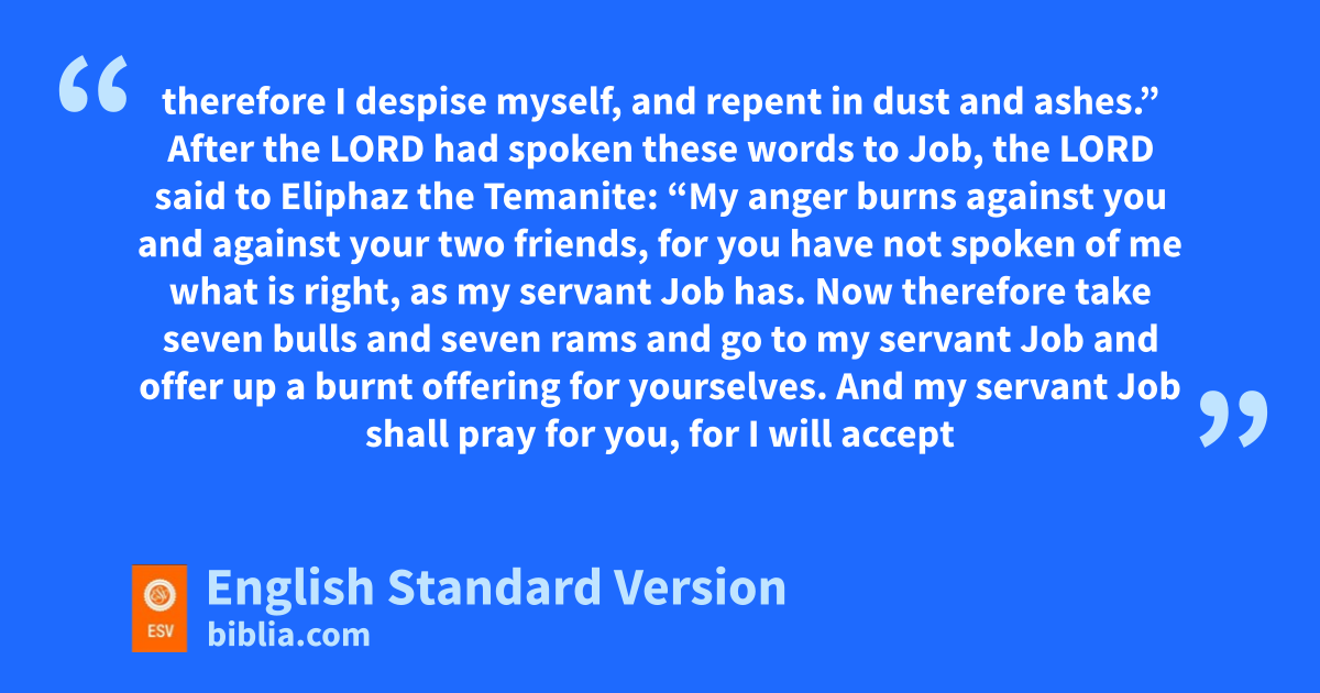 7 After the Lord had spoken these words to Job, the Lord said to Eliphaz mthe Temanite: “My anger burns against you and against your two friends, for you have not spoken of me what is right, as my servant Job has. 8 Now therefore take nseven bulls and seven rams and go to my servant Job and ooffer up a burnt offering for yourselves. And my servant Job shall ppray for you, for I will accept his prayer not to deal with you according to your folly. For you have not spoken of me what is right, as my servant Job has.” 9 qSo Eliphaz the Temanite and Bildad the Shuhite and Zophar the Naamathite went and did what the Lord had told them, and the Lord accepted Job’s prayer.