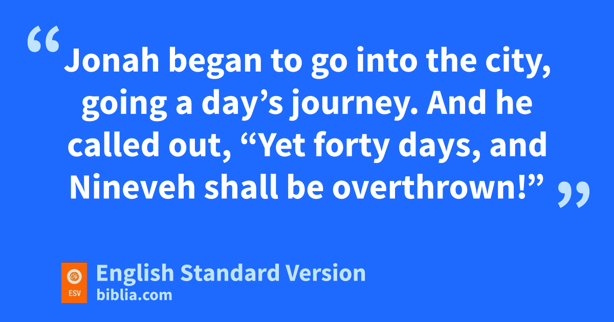 3 Then the word of the Lord came to Jonah the second time, saying, 2 “Arise, go to lNineveh, that great city, and call out against it the message that I tell you.” 3 So Jonah arose and went to Nineveh, according to the word of the Lord. Now lNineveh was an exceedingly great city,1 three days’ journey in breadth.2 4 Jonah began to go into the city, going a day’s journey. And he called out, “Yet forty days, and Nineveh shall be overthrown!” 5 mAnd the people of Nineveh believed God. nThey called for a fast and oput on sackcloth, from the greatest of them to the least of them.