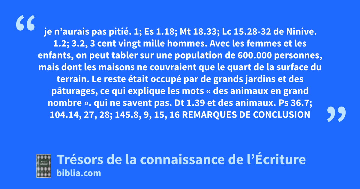 je n’aurais pas pitié. 1; Es 1.18; Mt 18.33; Lc 15.28-32 de Ninive. 1.2; 3.2, 3 cent vingt mille hommes. Avec les femmes et les enfants, on peut tabler sur une population de 600.000 personnes, mais dont les maisons ne couvraient que le quart de la surface du terrain. Le reste était occupé par de grands jardins et des pâturages, ce qui explique les mots « des animaux en grand nombre ». qui ne savent pas. Dt 1.39 et des animaux. Ps 36.7; 104.14, 27, 28; 145.8, 9, 15, 16