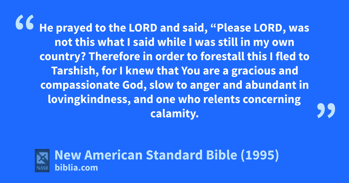 2 He aprayed to the Lord and said, “Please Lord, was not this 1what I said while I was still in my own country? Therefore 2in order to forestall this I bfled to Tarshish, for I knew that You are a cgracious and compassionate God, slow to anger and abundant in lovingkindness, and one who relents concerning calamity.
