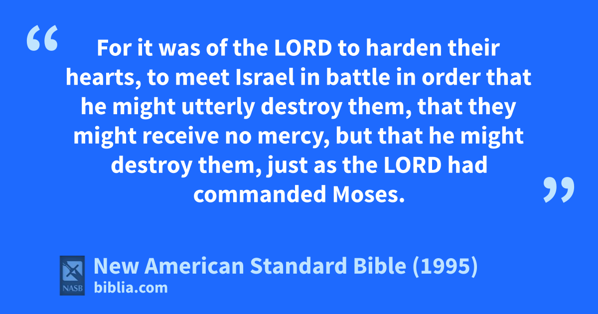 20 aFor it was of the Lord to 1harden their hearts, to meet Israel in battle in order that he might butterly destroy them, that they might 2receive no mercy, but that he might destroy them, just as the Lord had commanded Moses.