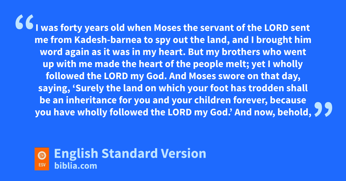 6 Then the people of Judah came to Joshua at Gilgal. And Caleb the son of Jephunneh the rKenizzite said to him, “You know swhat the Lord said to Moses the man of God in Kadesh-barnea concerning you and me. 7 I was forty years old when Moses the servant of the Lord tsent me from Kadesh-barnea to spy out the land, and I brought him word again as it was in my heart. 8 But umy brothers who went up with me made the heart of the people melt; yet I wholly followed the Lord my God. 9 And Moses swore on that day, saying, v‘Surely the land won which your foot has trodden shall be an inheritance for you and your children forever, because you have wholly followed the Lord my God.’ 10 And now, behold, the Lord has kept me alive, xjust as he said, these yforty-five years since the time that the Lord spoke this word to Moses, while Israel walked in the wilderness. And now, behold, I am this day yeighty-five years old. 11 zI am still as strong today as I was in the day that Moses sent me; my strength now is as my strength was then, for war and afor going and coming. 12 So now give me this hill country of which the Lord spoke on that day, for you heard on that day how the bAnakim were there, with great fortified cities. It may be that the Lord will be with me, and I shall drive them out just as the Lord said.”