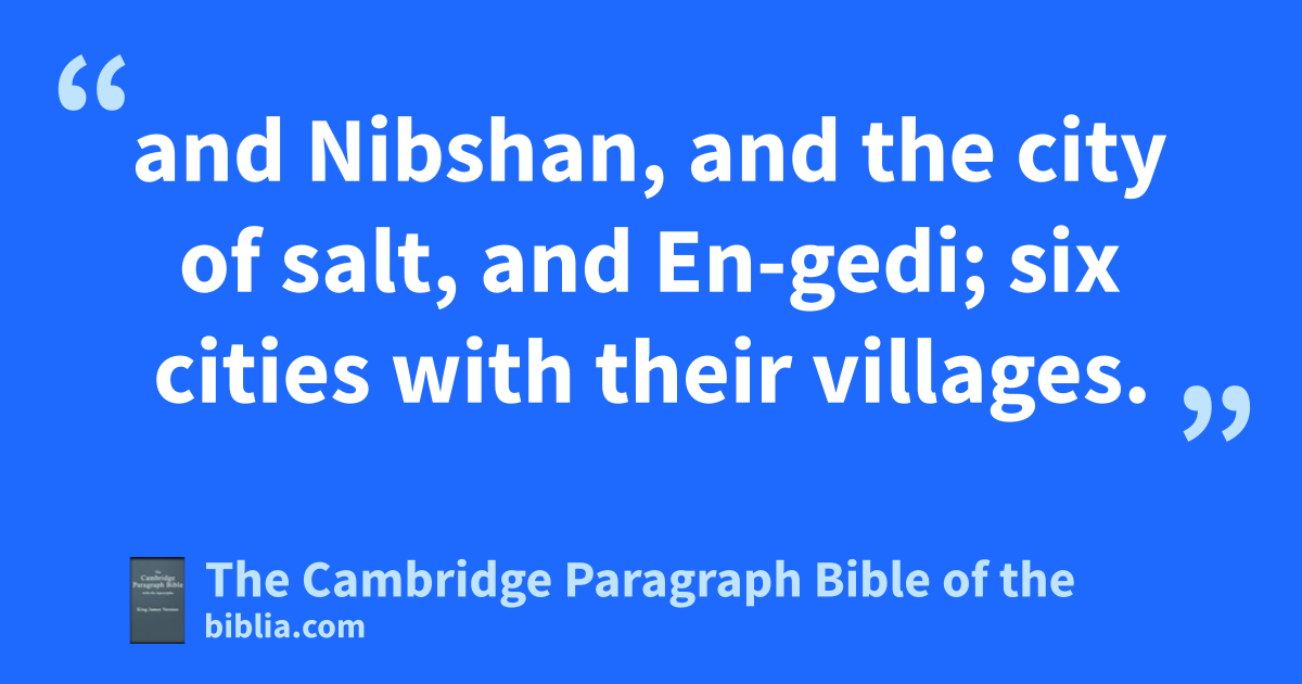 61 In the wilderness, kBeth-arabah, Middin, and Secacah, 62 and Nibshan, and the city of salt, and lEn-gedi; six cities with their villages. 63 mAs for the Jebusites the inhabitants of Jerusalem, the children of Judah could not drive them out: but the Jebusites dwell with the children of Judah at Jerusalem unto this day.