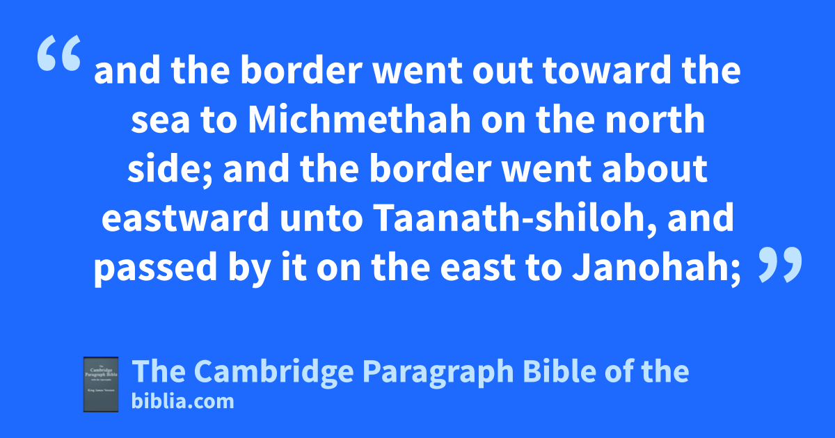 5 And the border of the children of Ephraim according to their families was thus: even the border of their inheritance on the east side was gAtaroth-addar, unto hBeth-horon the upper; 6 and the border went out toward the sea to iMichmethah on the north side; and the border went about eastward unto Taanath-kshiloh, and passed by it on the east to Janohah; 7 and it went down from Janohah to Ataroth, and to lNaarath, and came to Jericho, and went out at Jordan. 8 The border went out from mTappuah westward unto the nriver Kanah; and the goings out thereof were at the sea. This is the inheritance of the tribe of the children of Ephraim by their families. 9 And othe separate cities for the children of Ephraim were among the inheritance of the children of Manasseh, all the cities with their villages. 10 pAnd they drave not out the Canaanites that dwelt in Gezer: but the Canaanites dwell among the Ephraimites unto this day, and qserve under tribute.