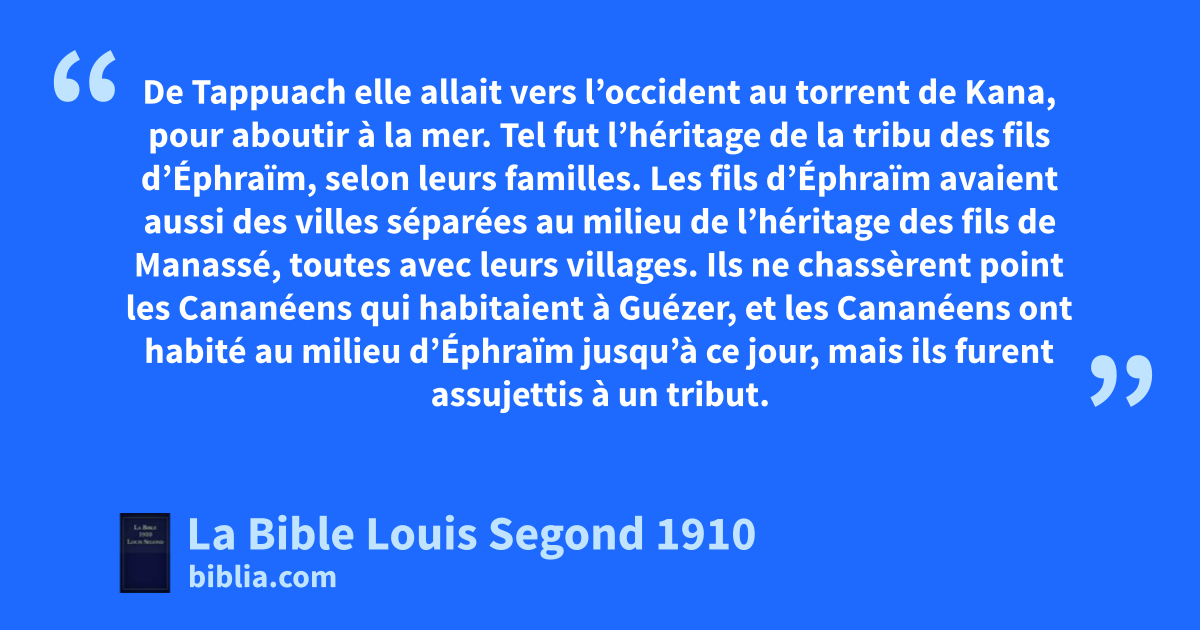 1La part échue par le sort aux fils de Joseph s’étendait depuis le Jourdain près de Jéricho, vers les eaux de Jéricho, à l’orient. La limite suivait le désert qui s’élève de Jéricho à Béthel par la montagne. 2Elle continuait de Béthel à Luz, et passait vers la frontière des Arkiens par Atharoth. 3Puis elle descendait à l’occident vers la frontière des Japhléthiens jusqu’à celle de Beth-Horon la basse et jusqu’à Guézer, pour aboutir à la mer. 4C’est là que reçurent leur héritage les fils de Joseph, Manassé et Éphraïm. 5Voici les limites des fils d’Éphraïm, selon leurs familles. La limite de leur héritage était, à l’orient, Atharoth-Addar jusqu’à Beth-Horon la haute. 6Elle continuait du côté de l’occident vers Micmethath au nord, tournait à l’orient vers Thaanath-Silo, et passait dans la direction de l’orient par Janoach. 7De Janoach elle descendait à Atharoth et à Naaratha, touchait à Jéricho, et se prolongeait jusqu’au Jourdain. 8De Tappuach elle allait vers l’occident au torrent de Kana, pour aboutir à la mer. Tel fut l’héritage de la tribu des fils d’Éphraïm, selon leurs familles. 9Les fils d’Éphraïm avaient aussi des villes séparées au milieu de l’héritage des fils de Manassé, toutes avec leurs villages. 10Ils ne chassèrent point les Cananéens qui habitaient à Guézer, et les Cananéens ont habité au milieu d’Éphraïm jusqu’à ce jour, mais ils furent assujettis à un tribut.