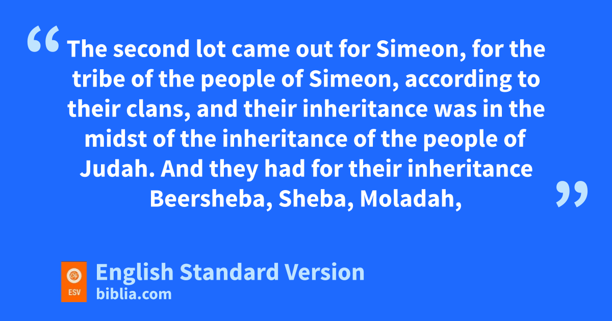 19 The second lot came out for Simeon, for the tribe of the people of Simeon, according to their clans, pand their inheritance was in the midst of the inheritance of the people of Judah. 2 qAnd they had for their inheritance Beersheba, Sheba, Moladah, 3 Hazar-shual, Balah, Ezem, 4 Eltolad, Bethul, Hormah, 5 Ziklag, Beth-marcaboth, Hazar-susah, 6 Beth-lebaoth, and Sharuhen—thirteen cities with their villages; 7 Ain, Rimmon, Ether, and Ashan—four cities with their villages, 8 together with all the villages around these cities as far as Baalath-beer, Ramah of the Negeb. This was the inheritance of the tribe of the people of Simeon according to their clans. 9 rThe inheritance of the people of Simeon formed part of the territory of the people of Judah. Because the portion of the people of Judah was too large for them, the people of Simeon obtained an inheritance in the midst of their inheritance.