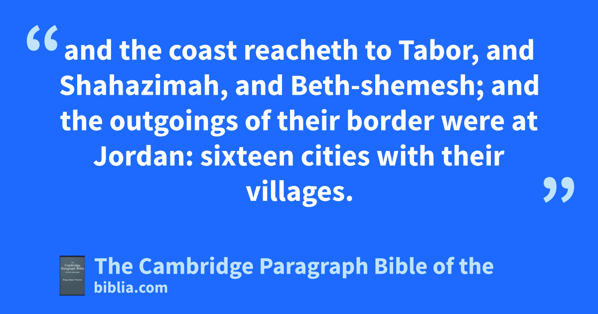 17 And the fourth lot came out to Issachar, for the children of Issachar according to their families. 18 And their border was toward wJezreel, and xChesulloth, and yShunem, 19 and Hapharaim, and Shion, and Anaharath, 20 and Rabbith, and zKishion, and Abez, 21 and Remeth, and zEn-gannim, and En-haddah, and Beth-pazzez; 22 and the coast reacheth to aTabor, and Shahazimah, and bBeth-shemesh; and the outgoings of their border were at Jordan: sixteen cities with their villages. 23 This is the inheritance of the tribe of the children of Issachar according to their families, the cities and their villages.