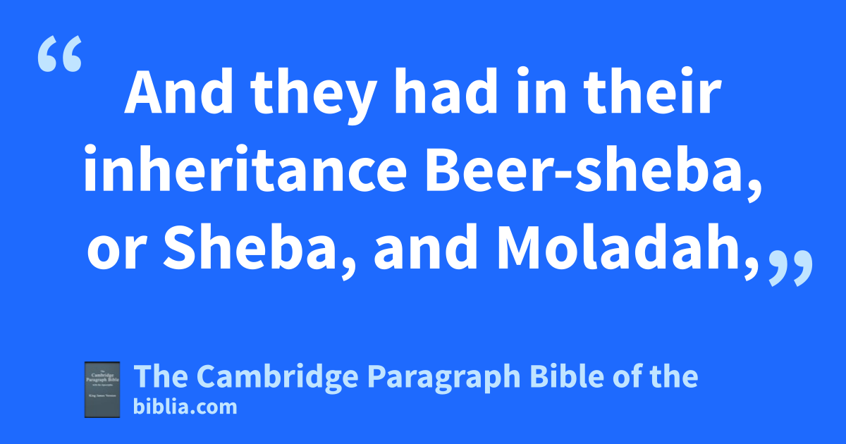 XIX. And the second lot came forth to Simeon, even for the tribe of the children of Simeon according to their families: aand their inheritance was within the inheritance of the children of Judah. 2 And bthey had in their inheritance cBeer-sheba, dor Sheba, and Moladah, 3 and eHazar-shual, and Balah, and eAzem, 4 and eEltolad, and Bethul, and fHormah, 5 and gZiklag, and Beth-marcaboth, and Hazar-susah, 6 and Beth-hlebaoth, and Sharuhen; thirteen cities and their villages: 7 hAin, hRemmon, and iEther, and iAshan; four cities and their villages: 8 and all the villages that were round about these cities to jBaalath-beer, kRamath of the south. This is the inheritance of the tribe of the children of Simeon according to their families. 9 Out of the portion of the children of Judah was the inheritance of the children of Simeon: for the part of the children of Judah was too much for them: ltherefore the children of Simeon had their inheritance within the inheritance of them.