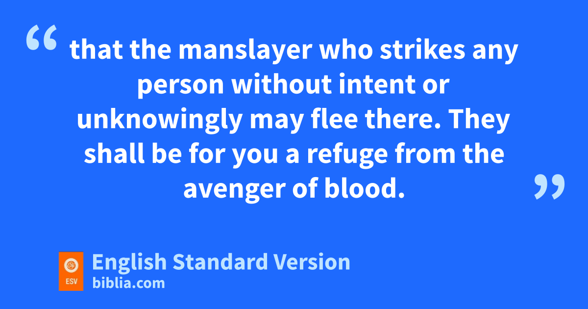 20 Then the Lord said to Joshua, 2 “Say to the people of Israel, j‘Appoint the cities of refuge, of which I spoke to you through Moses, 3 that the manslayer who strikes any person without intent or unknowingly may flee there. They shall be for you a refuge from the avenger of blood. 4 He shall flee to one of these cities and shall stand kat the entrance of the gate of the city and explain his case to the elders of that city. Then they shall take him into the city and give him a place, and he shall remain with them. 5 And if the avenger of blood pursues him, they shall not give up the manslayer into his hand, because he struck his neighbor unknowingly, and did not hate him in the past. 6 And he shall remain in that city luntil he has stood before the congregation for judgment, until the death of him who is high priest at the time. Then the manslayer may return to his own town and his own home, to the town from which he fled.’ ”