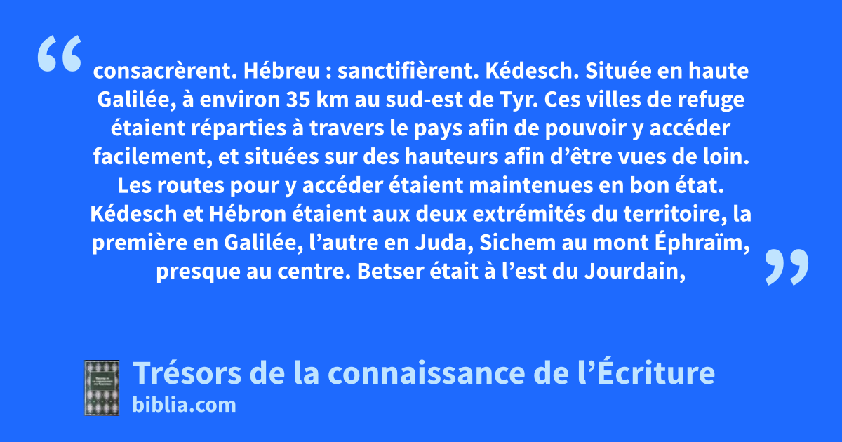 consacrèrent. Hébreu : sanctifièrent. Kédesch. Située en haute Galilée, à environ 35 km au sud-est de Tyr. Ces villes de refuge étaient réparties à travers le pays afin de pouvoir y accéder facilement, et situées sur des hauteurs afin d’être vues de loin. Les routes pour y accéder étaient maintenues en bon état. Kédesch et Hébron étaient aux deux extrémités du territoire, la première en Galilée, l’autre en Juda, Sichem au mont Éphraïm, presque au centre. Betser était à l’est du Jourdain, sur la partie orientale de la plaine face à Jéricho ; Ramoth était au centre des deux tribus et demie, dans les montagnes de Galaad, et Golan était dans la tribu de Manassé, sur les terres de Basan. Cette institution étant considérée comme un type de Christ, on peut trouver une signification aux noms de ces villes en application au seigneur comme Notre Refuge. Kédesch signifie saint, comme notre refuge est Jésus le Saint. Sichem, une épaule, comme celle sur laquelle nous pouvons nous appuyer. Hébron : communion, et les croyants sont appelés à la communion avec Jésus notre Seigneur. Betser : une fortification, et Jésus tient fermement ceux qui croient en lui. Ramoth : haut, ou élevé, et Jésus a été exalté par Dieu. Golan, joie, ou exultation, et en Jésus tous les saints sont justifiés et le glorifient. 21.32; 1Ch 6.76 Sichem. 21.21; Gn 33.18, 19; 2Ch 10.1 Kirjath-Arba. 14.14; 21.11, 13 dans la montagne. Lc 1.39
