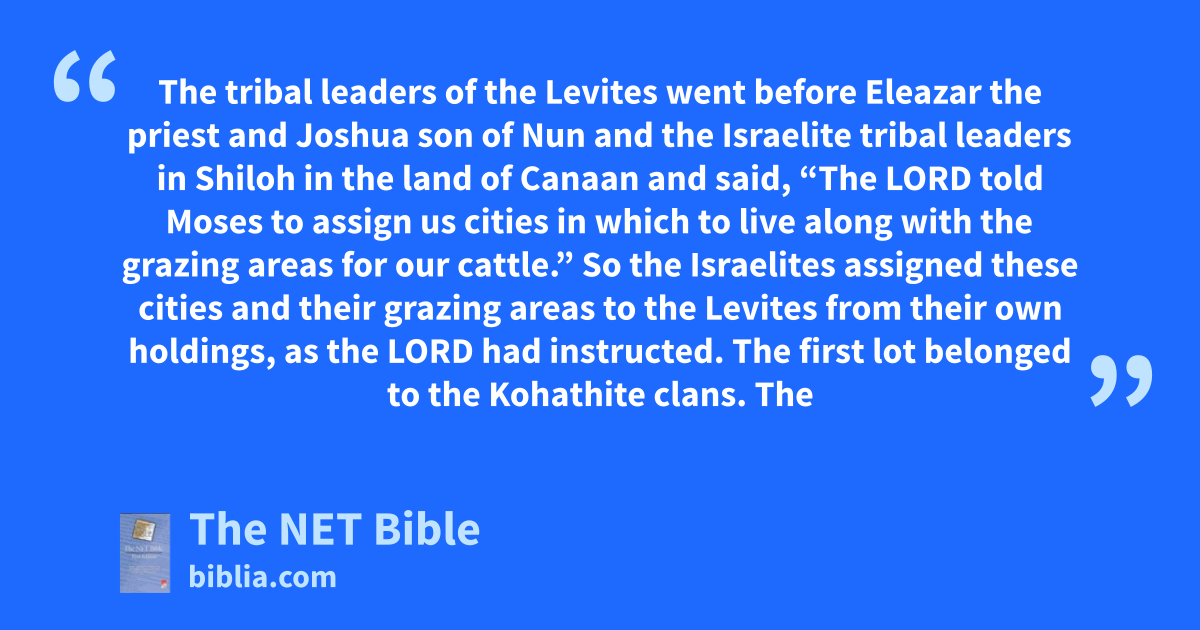 21:1 The tribal leaders of the Levites went before Eleazar the priest and Joshua son of Nun and the Israelite tribal leaders 21:2 in Shiloh in the land of Canaan and said, “The Lord told Moses to assign us cities in which to live along with the grazing areas for our cattle.” 21:3 So the Israelites assigned these cities and their grazing areas to the Levites from their own holdings, as the Lord had instructed.