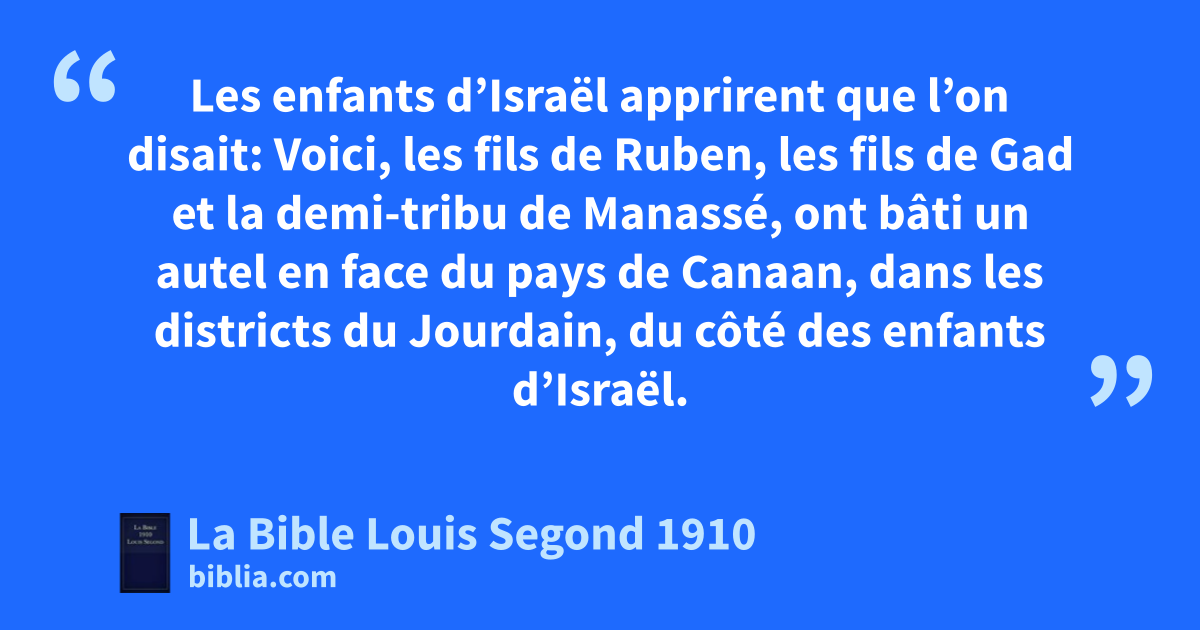 10dQuand ils furent arrivés aux districts du Jourdain qui appartiennent au pays de Canaan, les fils de Ruben, les fils de Gad et la demi-tribu de Manassé, y bâtirent un autel sur le Jourdain, un autel dont la grandeur frappait les regards. 11Les enfants d’Israël apprirent que l’on disait: Voici, les fils de Ruben, les fils de Gad et la demi-tribu de Manassé, ont bâti un autel en face du pays de Canaan, dans les districts du Jourdain, du côté des enfants d’Israël. 12Lorsque les enfants d’Israël eurent appris cela, toute l’assemblée des enfants d’Israël se réunit à Silo, pour monter contre eux et leur faire la guerre. 13Les enfants d’Israël envoyèrent auprès des fils de Ruben, des fils de Gad et de la demi-tribu de Manassé, au pays de Galaad, Phinées, fils du sacrificateur Éléazar, 14et dix princes avec lui, un prince par maison paternelle pour chacune des tribus d’Israël; tous étaient chefs de maison paternelle parmi les milliers d’Israël. 15Ils se rendirent auprès des fils de Ruben, des fils de Gad et de la demi-tribu de Manassé, au pays de Galaad, et ils leur adressèrent la parole, en disant: 16Ainsi parle toute l’assemblée de l’Éternel: Que signifie cette infidélité que vous avez commise envers le Dieu d’Israël, et pourquoi vous détournez-vous maintenant de l’Éternel, en vous bâtissant un autel pour vous révolter aujourd’hui contre l’Éternel? 17eRegardons-nous comme peu de chose le crime de Peor, dont nous n’avons pas jusqu’à présent enlevé la tache de dessus nous, malgré la plaie qu’il attira sur l’assemblée de l’Éternel? 18Et vous vous détournez aujourd’hui de l’Éternel! Si vous vous révoltez aujourd’hui contre l’Éternel, demain il s’irritera contre toute l’assemblée d’Israël. 19Si vous tenez pour impur le pays qui est votre propriété, passez dans le pays qui est la propriété de l’Éternel, où est fixée la demeure de l’Éternel, et établissez-vous au milieu de nous; mais ne vous révoltez pas contre l’Éternel et ne vous séparez pas de nous, en vous bâtissant un autel, outre l’autel de l’Éternel, notre Dieu. 20Acan, fils de Zérach, ne commit-il pas une infidélité au sujet des choses dévouées par interdit, et la colère de l’Éternel ne s’enflamma-t-elle pas contre toute l’assemblée d’Israël? Il ne fut pas le seul qui périt à cause de son crime.