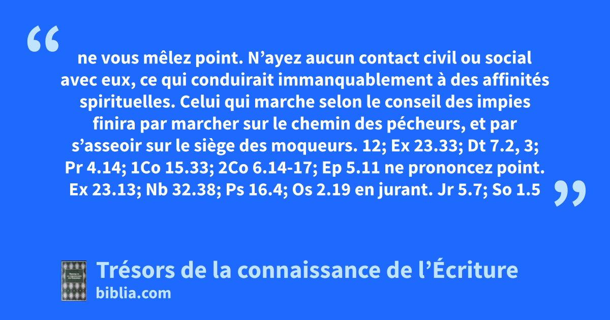 ne vous mêlez point. N’ayez aucun contact civil ou social avec eux, ce qui conduirait immanquablement à des affinités spirituelles. Celui qui marche selon le conseil des impies finira par marcher sur le chemin des pécheurs, et par s’asseoir sur le siège des moqueurs. 12; Ex 23.33; Dt 7.2, 3; Pr 4.14; 1Co 15.33; 2Co 6.14-17; Ep 5.11 ne prononcez point. Ex 23.13; Nb 32.38; Ps 16.4; Os 2.19 en jurant. Jr 5.7; So 1.5