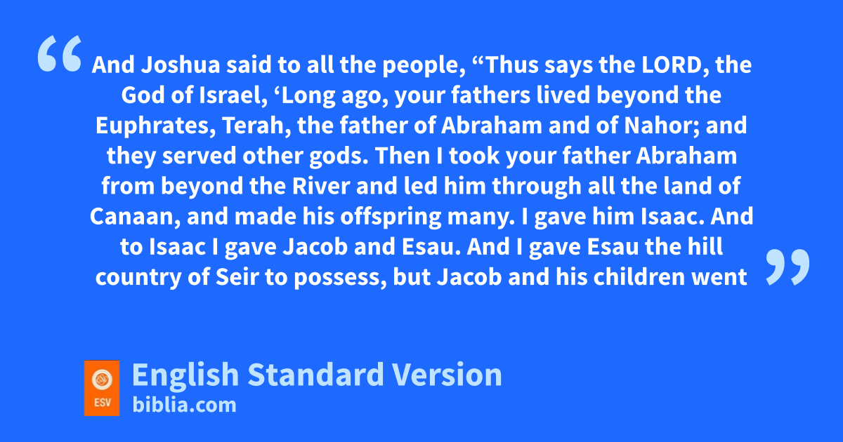 24 Joshua gathered all the tribes of Israel cto Shechem and dsummoned the elders, the heads, the judges, and the officers of Israel. And ethey presented themselves before God. 2 And Joshua said to all the people, “Thus says the Lord, the God of Israel, ‘Long ago, fyour fathers lived beyond the Euphrates,1 Terah, the father of Abraham and of Nahor; and gthey served other gods. 3 hThen I took your father Abraham from beyond the River2 and iled him through all the land of Canaan, and made his offspring many. jI gave him Isaac. 4 And to Isaac I gave kJacob and Esau. lAnd I gave Esau the hill country of Seir to possess, mbut Jacob and his children went down to Egypt. 5 nAnd I sent Moses and Aaron, oand I plagued Egypt with what I did in the midst of it, and pafterward I brought you out.