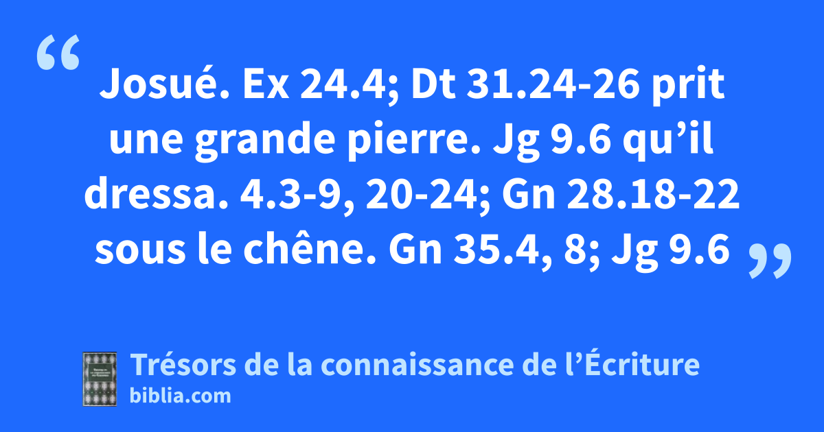 Josué. Ex 24.4; Dt 31.24-26 prit une grande pierre. Jg 9.6 qu’il dressa. 4.3-9, 20-24; Gn 28.18-22 sous le chêne. Gn 35.4, 8; Jg 9.6