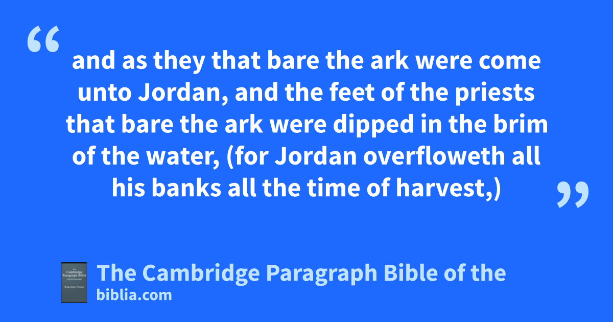 14 And it came to pass, when the people removed from their tents, to pass over Jordan, and the priests bearing the tark of the covenant before the people; 15 and as they that bare the ark were come unto Jordan, and uthe feet of the priests that bare the ark were dipped in the brim of the water, (for xJordan overfloweth all his banks yall the time of harvest,) 16 That the waters which came down from above stood and rose up upon a heap very far, from the city Adam, that is beside zZaretan: and those that came down atoward the sea of the plain, even bthe salt sea, failed, and were cut off: and the people passed over right against Jericho. 17 And the priests that bare the ark of the covenant of the Lord stood firm on dry ground in the midst of Jordan, cand all the Israelites passed over on dry ground, until all the people were passed clean over Jordan.