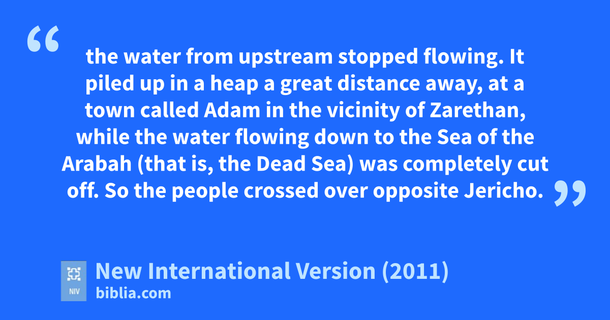 14 So when the people broke camp to cross the Jordan, the priests carrying the ark of the covenantu went aheadv of them. 15 Now the Jordanw is at flood stagex all during harvest.y Yet as soon as the priests who carried the ark reached the Jordan and their feet touched the water’s edge, 16 the water from upstream stopped flowing.z It piled up in a heapa a great distance away, at a town called Adam in the vicinity of Zarethan,b while the water flowing downc to the Sea of the Arabahd (that is, the Dead Seae) was completely cut off.f So the people crossed over opposite Jericho.g 17 The priestsh who carried the ark of the covenant of the Lord stopped in the middle of the Jordan and stood on dry ground,i while all Israel passed by until the whole nation had completed the crossing on dry ground.j