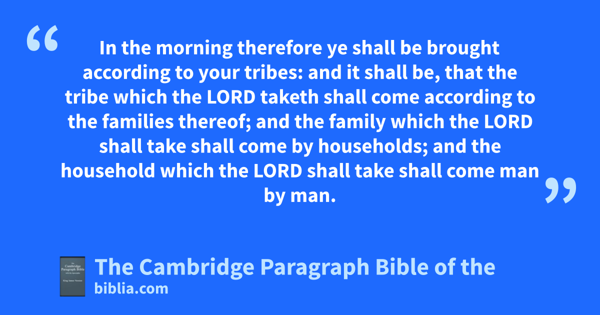 16 So Joshua rose up early in the morning, and brought Israel by their tribes; and the tribe of Judah was taken: 17 and he brought the family of Judah; and he took the family of tthe Zarhites: and he brought the family of the Zarhites man by man; and Zabdi was taken: 18 and he brought his household man by man; and uAchan, the son of Carmi, the son of Zabdi, the son of Zerah, of the tribe of Judah, vwas taken. 19 And Joshua said unto Achan, My son, wgive, I pray thee, glory to the Lord God of Israel, and xmake confession unto him; and ytell me now what thou hast done; hide it not from me. 20 And Achan answered Joshua, and said, Indeed I have sinned against the Lord God of Israel, and thus and thus have I done: 21 when I saw among the spoils a goodly zBabylonish garment, and two hundred shekels of silver, and a * wedge of gold of fifty shekels weight, then I coveted them, and took them; and behold, they are hid in the earth in the midst of my tent, and the silver under it. 22 So Joshua sent messengers, and they ran unto the tent; and behold, it was hid in his tent, and the silver under it. 23 And they took them out of the midst of the tent, and brought them unto Joshua, and unto all the children of Israel, and * laid them out before the Lord. 24 And Joshua, and all Israel with him, took Achan the son of Zerah, and the silver, and the garment, and the wedge of gold, and his sons, and his daughters, and his oxen, and his asses, and his sheep, and his tent, and all that he had: and they brought them unto athe valley of Achor. 25 And Joshua said, bWhy hast thou troubled us? the Lord shall trouble thee this day. And all Israel stoned him with stones, and burned them with fire, after they had cstoned them with stones. 26 And they draised over him a great heap of stones unto this day. So ethe Lord turned from the fierceness of his anger. Wherefore the name of that place was called, fThe valley of * Achor, unto this day.