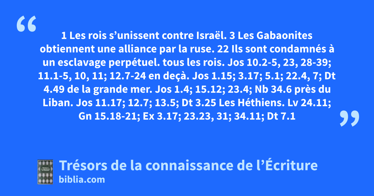 1 Les rois s’unissent contre Israël. 3 Les Gabaonites obtiennent une alliance par la ruse. 22 Ils sont condamnés à un esclavage perpétuel. tous les rois. Jos 10.2-5, 23, 28-39; 11.1-5, 10, 11; 12.7-24 en deçà. Jos 1.15; 3.17; 5.1; 22.4, 7; Dt 4.49 de la grande mer. Jos 1.4; 15.12; 23.4; Nb 34.6 près du Liban. Jos 11.17; 12.7; 13.5; Dt 3.25 Les Héthiens. Lv 24.11; Gn 15.18-21; Ex 3.17; 23.23, 31; 34.11; Dt 7.1