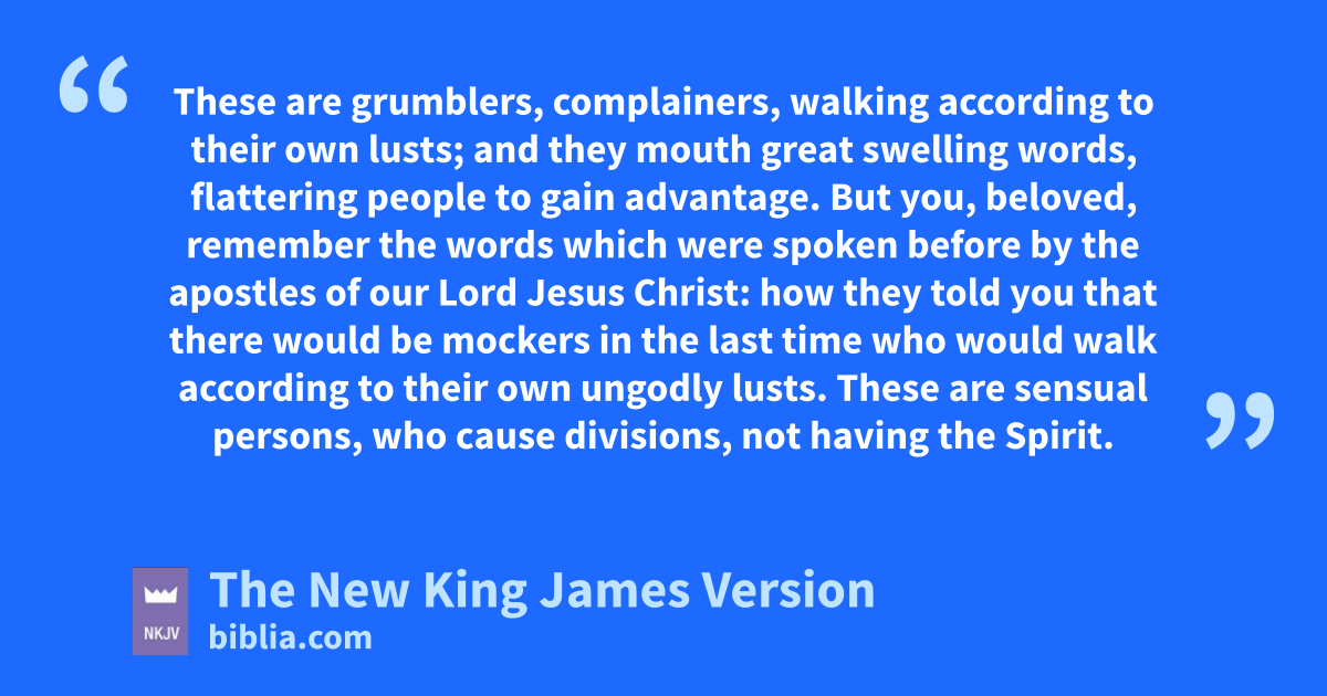 16 These are grumblers, complainers, walking according to their own lusts; and they tmouth great swelling words, uflattering people to gain advantage. 17 vBut you, beloved, remember the words which were spoken before by the apostles of our Lord Jesus Christ: 18 how they told you that wthere would be mockers in the last time who would walk according to their own ungodly lusts. 19 These are 9sensual persons, who cause divisions, not having the Spirit.
