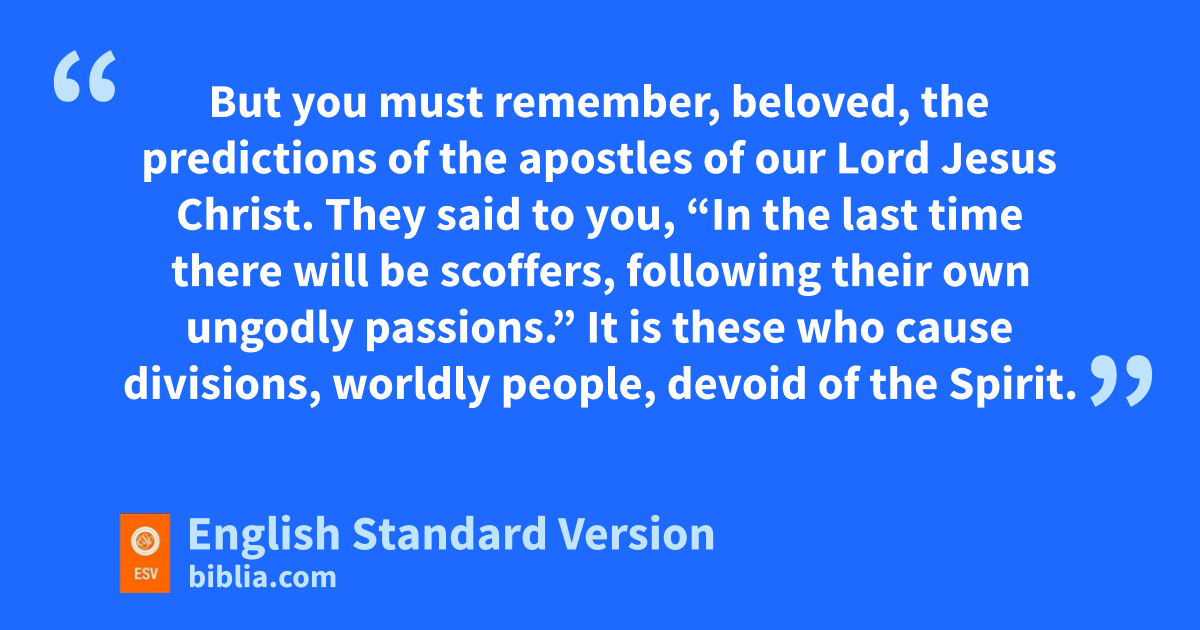 17 But you must tremember, beloved, the predictions of the apostles of our Lord Jesus Christ. 18 They6 said to you, u“In the last time there will be scoffers, following their own ungodly passions.” 19 It is these who cause divisions, worldly people, vdevoid of the Spirit. 20 But you, beloved, wbuilding yourselves up in your most holy faith and xpraying in the Holy Spirit, 21 ykeep yourselves in the love of God, zwaiting for the mercy of our Lord Jesus Christ that leads to eternal life. 22 And have mercy on those who doubt; 23 save others by asnatching them out of bthe fire; to others show mercy cwith fear, hating even dthe garment7 stained by the flesh.