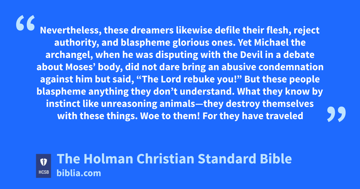 8 Nevertheless, these dreamers likewise defile their flesh, reject authority, and blaspheme glorious ones. u 9 Yet Michael v the archangel, w when he was disputing with the Devil x in a debate about Moses’ y body, did not dare bring an abusive condemnation against him but said, “The Lord rebuke you!” 10 But these people blaspheme anything they don’t understand. What they know by instinct like unreasoning animals—they destroy themselves with these things. 11 Woe to them! For they have traveled in the way of Cain, z have abandoned themselves to the error of Balaam a for profit, and have perished in Korah’s rebellion. b
