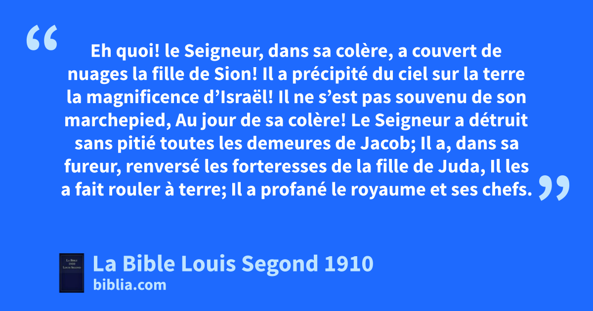 1Eh quoi! le Seigneur, dans sa colère, a couvert de nuages la fille de Sion!