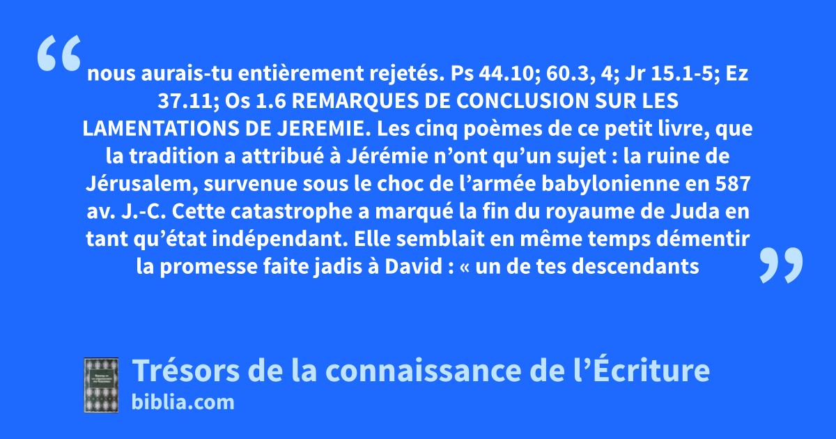 Les cinq poèmes de ce petit livre, que la tradition a attribué à Jérémie n’ont qu’un sujet : la ruine de Jérusalem, survenue sous le choc de l’armée babylonienne en 587 av. J.-C. Cette catastrophe a marqué la fin du royaume de Juda en tant qu’état indépendant. Elle semblait en même temps démentir la promesse faite jadis à David : « un de tes descendants régnera toujours après toi, car le pouvoir royal de ta famille sera inébranlable ». (2S 7.16. Ceux qui ont survécu à ce drame se remémorent les événements tragiques qu’ils ont traversés et s’efforcent de les comprendre. Qui est responsable de toutes ces horreurs ? Le Seigneur ne s’est-il pas comporté en véritable ennemi de son peuple ? Pourtant les vaincus reconnaissent leurs propres torts ; ils se rappellent que les bontés du Seigneur ne sont pas épuisées et que sa fidélité est grande. Lm 3.22-23. C’est là que reste la source de leur espérance malgré les évidences du désastre.