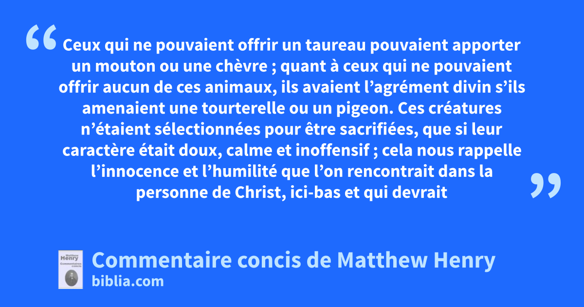 Ceux qui ne pouvaient offrir un taureau pouvaient apporter un mouton ou une chèvre ; quant à ceux qui ne pouvaient offrir aucun de ces animaux, ils avaient l’agrément divin s’ils amenaient une tourterelle ou un pigeon. Ces créatures n’étaient sélectionnées pour être sacrifiées, que si leur caractère était doux, calme et inoffensif ; cela nous rappelle l’innocence et l’humilité que l’on rencontrait dans la personne de Christ, ici-bas et qui devrait se trouver également chez les chrétiens.