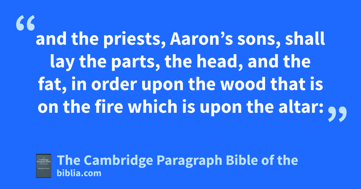 I. * And the Lord acalled unto Moses, and spake unto him bout of the tabernacle of the congregation, saying, 2 Speak unto the children of Israel, and say unto them, cIf any man of you bring an offering unto the Lord, ye shall bring your offering of the cattle, even of the herd, and of the flock. 3 If his offering be a burnt sacrifice of the herd, let him offer a male dwithout blemish: he shall offer it of his own voluntary will at the door of the tabernacle of the congregation before the Lord. 4 eAnd he shall put his hand upon the head of the burnt offering; and it shall be faccepted for him gto make atonement for him. 5 And he shall kill the bullock before the Lord: and the priests, Aaron’s sons, shall bring the blood, hand sprinkle the blood round about upon the altar that is by the door of the tabernacle of the congregation. 6 And he shall hflay the burnt offering, and cut it into his ipieces. 7 And the sons of Aaron the priest shall put fire upon the altar, and jlay the wood in order upon the fire: 8 and the priests, Aaron’s sons, shall lay ithe parts, the head, and kthe fat, in order upon the wood that is on the fire which is upon the altar: 9 but lhis inwards and his legs shall he wash in water: and the priest shall burn all on the altar, to be a burnt sacrifice, man offering made by fire, of a nsweet savour unto the Lord. 10 And if his offering be of the flocks, namely, of the sheep, or of the goats, for a burnt sacrifice; he shall bring it a male without blemish. 11 oAnd he shall kill it on the side of the altar northward before the Lord: and the priests, Aaron’s sons, shall sprinkle his blood round about upon the altar. 12 And he shall cut it into his ipieces, with his head and his fat: and the priest shall lay them in order on the wood that is on the fire which is upon the altar: 13 but he shall wash the inwards and the legs with water: and the priest shall bring it all, and burn it upon the altar: it is a burnt sacrifice, an offering made by fire, of a sweet savour unto the Lord. 14 And if the burnt sacrifice for his offering to the Lord be of fowls, then he shall bring his offering of pturtledoves, or of young pigeons. 15 And the priest shall bring it unto the altar, and * wring off his head, and burn it on the altar; and the blood thereof shall be wrung out at the side of the altar: 16 and he shall pluck away his crop with * his feathers, and cast it qbeside the altar on the east part, by the place of the ashes: 17 and he shall cleave it with the wings thereof, but rshall not divide it asunder: and the priest shall burn it upon the altar, upon the wood that is upon the fire: sit is a burnt sacrifice, an offering made by fire, of a sweet savour unto the Lord.