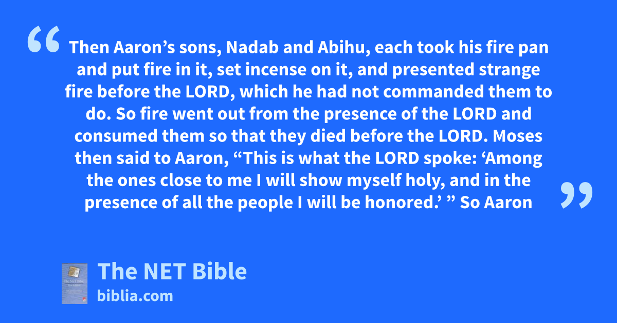 10:1 Then1 Aaron’s sons, Nadab and Abihu, each took his fire pan and put fire in it, set incense on it, and presented strange fire2 before the Lord, which he had not commanded them to do. 10:2 So fire went out from the presence of the Lord3 and consumed them so that they died before the Lord. 10:3 Moses then said to Aaron, “This is what the Lord spoke: ‘Among the ones close to me I will show myself holy,4 and in the presence of all the people I will be honored.’ ”5 So Aaron kept silent. 10:4 Moses then called to Mishael and Elzaphan, the sons of Uzziel, Aaron’s uncle, and said to them, “Come near, carry your brothers away from the front of the sanctuary to a place outside the camp.” 10:5 So they came near and carried them away in their tunics to a place outside the camp just as Moses had spoken. 10:6 Then Moses said to Aaron and to Eleazar and Ithamar his other two sons, “Do not6 dishevel the hair of your heads7 and do not tear your garments, so that you do not die and so that wrath does not come on the whole congregation. Your brothers, all the house of Israel, are to mourn the burning which the Lord has caused,8 10:7 but you must not go out from the entrance of the Meeting Tent lest you die, for the Lord’s anointing oil is on you.” So they acted according to the word of Moses.