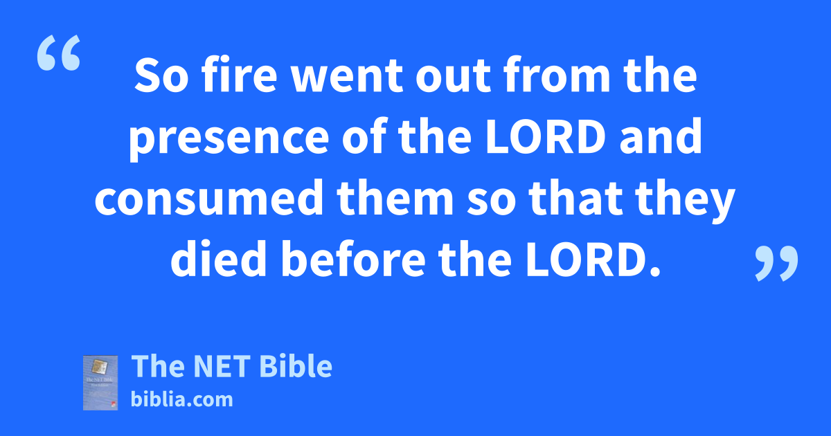 10:1 Then1 Aaron’s sons, Nadab and Abihu, each took his fire pan and put fire in it, set incense on it, and presented strange fire2 before the Lord, which he had not commanded them to do. 10:2 So fire went out from the presence of the Lord3 and consumed them so that they died before the Lord. 10:3 Moses then said to Aaron, “This is what the Lord spoke: ‘Among the ones close to me I will show myself holy,4 and in the presence of all the people I will be honored.’ ”5 So Aaron kept silent. 10:4 Moses then called to Mishael and Elzaphan, the sons of Uzziel, Aaron’s uncle, and said to them, “Come near, carry your brothers away from the front of the sanctuary to a place outside the camp.” 10:5 So they came near and carried them away in their tunics to a place outside the camp just as Moses had spoken. 10:6 Then Moses said to Aaron and to Eleazar and Ithamar his other two sons, “Do not6 dishevel the hair of your heads7 and do not tear your garments, so that you do not die and so that wrath does not come on the whole congregation. Your brothers, all the house of Israel, are to mourn the burning which the Lord has caused,8 10:7 but you must not go out from the entrance of the Meeting Tent lest you die, for the Lord’s anointing oil is on you.” So they acted according to the word of Moses.