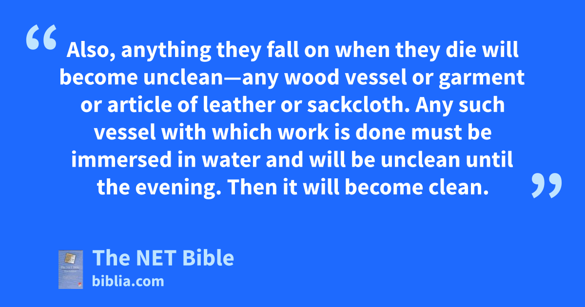11:29 “ ‘Now this is what is unclean to you among the swarming things that swarm on the land:27 the rat, the mouse, the large lizard of any kind, 11:30 the Mediterranean gecko, the spotted lizard, the wall gecko, the skink, and the chameleon. 11:31 These are the ones that are unclean to you among all the swarming things. Anyone who touches them when they die will be unclean until evening. 11:32 Also, anything they fall on28 when they die will become unclean—any wood vessel or garment or article of leather or sackcloth. Any such vessel with which work is done must be immersed in water29 and will be unclean until the evening. Then it will become clean. 11:33 As for any clay vessel they fall into,30 everything in it31 will become unclean and you must break it. 11:34 Any food that may be eaten which becomes soaked with water32 will become unclean. Anything drinkable33 in any such vessel will become unclean.34 11:35 Anything their carcass may fall on will become unclean. An oven or small stove must be smashed to pieces; they are unclean, and they will stay unclean35 to you. 11:36 However, a spring or a cistern which collects water36 will be clean, but one who touches their carcass will be unclean. 11:37 Now, if such a carcass falls on any sowing seed which is to be sown,37 it is clean, 11:38 but if water is put on the seed and such a carcass falls on it, it is unclean to you.