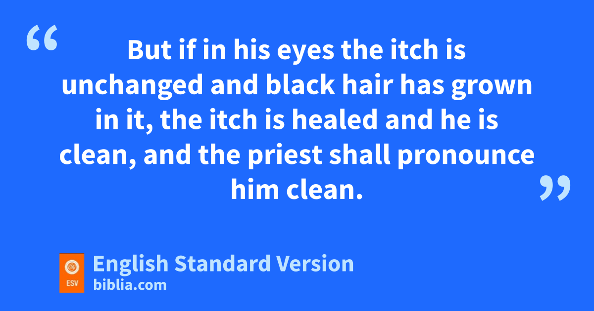 29 “When a man or woman has a disease on the head or the beard, 30 the priest shall examine the disease. And if it appears deeper than the skin, and the hair in it is yellow and thin, then the priest shall pronounce him unclean. It is an itch, a leprous disease of the head or the beard. 31 And if the priest examines the itching disease and it appears no deeper than the skin and there is no black hair in it, then the priest shall shut up the person with the itching disease for seven days, 32 and on the seventh day the priest shall examine the disease. If the itch has not spread, and there is in it no yellow hair, and the itch appears to be no deeper than the skin, 33 then he shall shave himself, but the itch he shall not shave; and the priest shall shut up the person with the itching disease for another seven days. 34 And on the seventh day the priest shall examine the itch, and if the itch has not spread in the skin and it appears to be no deeper than the skin, then the priest shall pronounce him clean. And lhe shall wash his clothes and be clean. 35 But if the itch spreads in the skin after his cleansing, 36 then the priest shall examine him, and if the itch has spread in the skin, the priest need not seek for the yellow hair; he is unclean. 37 But if in his eyes the itch is unchanged and black hair has grown in it, the itch is healed and he is clean, and the priest shall pronounce him clean.