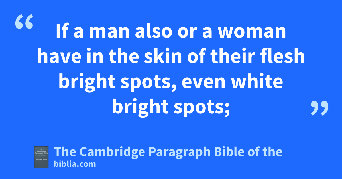 XIII. And the Lord spake unto Moses and Aaron, saying, 2 When a man shall have in the skin of his flesh aa * rising, a scab, or bright spot, and it be in the skin of his flesh like the plague of leprosy; bthen he shall be brought unto Aaron the priest, or unto one of his sons the priests: 3 and the priest shall look on the plague in the skin of the flesh: and when the hair in the plague is turned white, and the plague in sight be deeper than the skin of his flesh, it is a plague of leprosy: and the priest shall look on him, and pronounce him unclean. 4 If the bright spot be white in the skin of his flesh, and in sight be not deeper than the skin, and the hair thereof be not turned white; then the priest shall shut up him that hath the plague seven days: 5 and the priest shall look on him the seventh day: and behold, if the plague in his sight be at a stay, and the plague spread not in the skin; then the priest shall shut him up seven days more: 6 and the priest shall look on him again the seventh day: and behold, if the plague be somewhat dark, and the plague spread not in the skin, the priest shall pronounce him clean: it is but a scab: and he cshall wash his clothes, and be clean. 7 But if the scab spread much abroad in the skin, after that he hath been seen of the priest for his cleansing, he shall be seen of the priest again: 8 and if the priest see that behold, the scab spreadeth in the skin, then the priest shall pronounce him unclean: it is a leprosy.