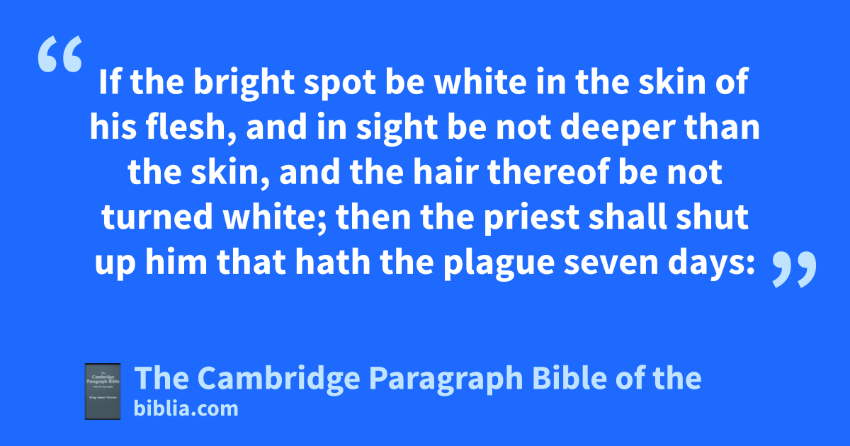 XIII. And the Lord spake unto Moses and Aaron, saying, 2 When a man shall have in the skin of his flesh aa * rising, a scab, or bright spot, and it be in the skin of his flesh like the plague of leprosy; bthen he shall be brought unto Aaron the priest, or unto one of his sons the priests: 3 and the priest shall look on the plague in the skin of the flesh: and when the hair in the plague is turned white, and the plague in sight be deeper than the skin of his flesh, it is a plague of leprosy: and the priest shall look on him, and pronounce him unclean. 4 If the bright spot be white in the skin of his flesh, and in sight be not deeper than the skin, and the hair thereof be not turned white; then the priest shall shut up him that hath the plague seven days: 5 and the priest shall look on him the seventh day: and behold, if the plague in his sight be at a stay, and the plague spread not in the skin; then the priest shall shut him up seven days more: 6 and the priest shall look on him again the seventh day: and behold, if the plague be somewhat dark, and the plague spread not in the skin, the priest shall pronounce him clean: it is but a scab: and he cshall wash his clothes, and be clean. 7 But if the scab spread much abroad in the skin, after that he hath been seen of the priest for his cleansing, he shall be seen of the priest again: 8 and if the priest see that behold, the scab spreadeth in the skin, then the priest shall pronounce him unclean: it is a leprosy.