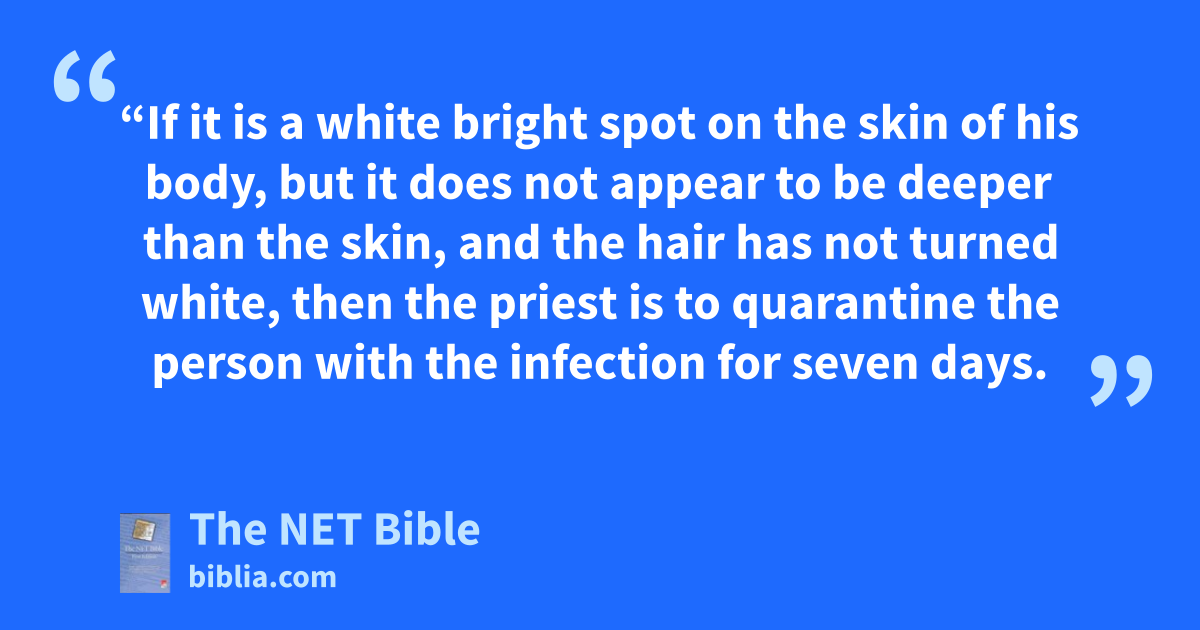 13:4 “If14 it is a white bright spot on the skin of his body, but it does not appear to be deeper than the skin,15 and the hair has not turned white, then the priest is to quarantine the person with the infection for seven days.16 13:5 The priest must then examine it on the seventh day, and if,17 as far as he can see, the infection has stayed the same18 and has not spread on the skin,19 then the priest is to quarantine the person for another seven days.20 13:6 The priest must then examine it again on the seventh day,21 and if22 the infection has faded and has not spread on the skin, then the priest is to pronounce the person clean.23 It is a scab,24 so he must wash his clothes25 and be clean. 13:7 If, however, the scab is spreading further26 on the skin after he has shown himself to the priest for his purification, then he must show himself to the priest a second time. 13:8 The priest must then examine it,27 and if28 the scab has spread on the skin, then the priest is to pronounce the person unclean.29 It is a disease.