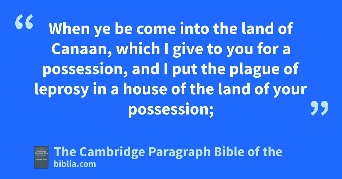 33 And the Lord spake unto Moses and unto Aaron, saying, 34 When ye be come into the land of Canaan, which I give to you afor a possession, and I put the plague of leprosy in a house of the land of your possession; 35 and he that owneth the house shall come and tell the priest, saying, It seemeth to me there is as it were ba plague in the house: 36 then the priest shall command that they * empty the house, before the priest go into it to see the plague, that all that is in the house be not made unclean: and afterward the priest shall go in to see the house: 37 and he shall look on the plague, and behold, if the plague be in the walls of the house with hollow strakes, greenish or reddish, which in sight are lower than the wall; 38 then the priest shall go out of the house to the door of the house, and shut up the house seven days: 39 and the priest shall come again the seventh day, and shall look: and behold, if the plague be spread in the walls of the house; 40 then the priest shall command that they take away the stones in which the plague is, and they shall cast them into an unclean place without the city: 41 and he shall cause the house to be scraped within round about, and they shall pour out the dust that they scrape off without the city into an unclean place: 42 and they shall take other stones, and put them in the place of those stones; and he shall take other morter, and cshall plaister the house. 43 And if the plague come again, and break out in the house, after that he hath taken away the stones, and after he hath scraped the house, and after it is plaistered; 44 then the priest shall come and look, and behold, if the plague be spread in the house, it is da fretting leprosy in the house: it is unclean. 45 And he shall ebreak down the house, the stones of it, and the timber thereof, and all the morter of the house; and he shall carry them forth out of the city into an unclean place. 46 Moreover he that goeth into the house all the while that it is shut up shall be unclean until the even. 47 And he that lieth in the house fshall wash his clothes; and he that eateth in the house shall wash his clothes. 48 And if the priest * shall come in, and look upon it, and behold, the plague hath not spread in the house, after the house was plaistered: then the priest shall pronounce the house clean, because the plague is healed. 49 And he shall take gto cleanse the house htwo birds, and cedar wood, and scarlet, and hyssop: 50 and he shall kill the one of the birds in an earthen vessel over running water: 51 and he shall take the cedar wood, and the hyssop, and the scarlet, and the living bird, and dip them in the blood of the slain bird, and in the running water, and sprinkle the house seven times: 52 and ghe shall cleanse the house with the blood of the bird, and with the running water, and with the living bird, and with the cedar wood, and with the hyssop, and with the scarlet: 53 but he shall let go the living bird out of the city into the open fields, and imake an atonement for the house: and it shall be clean.