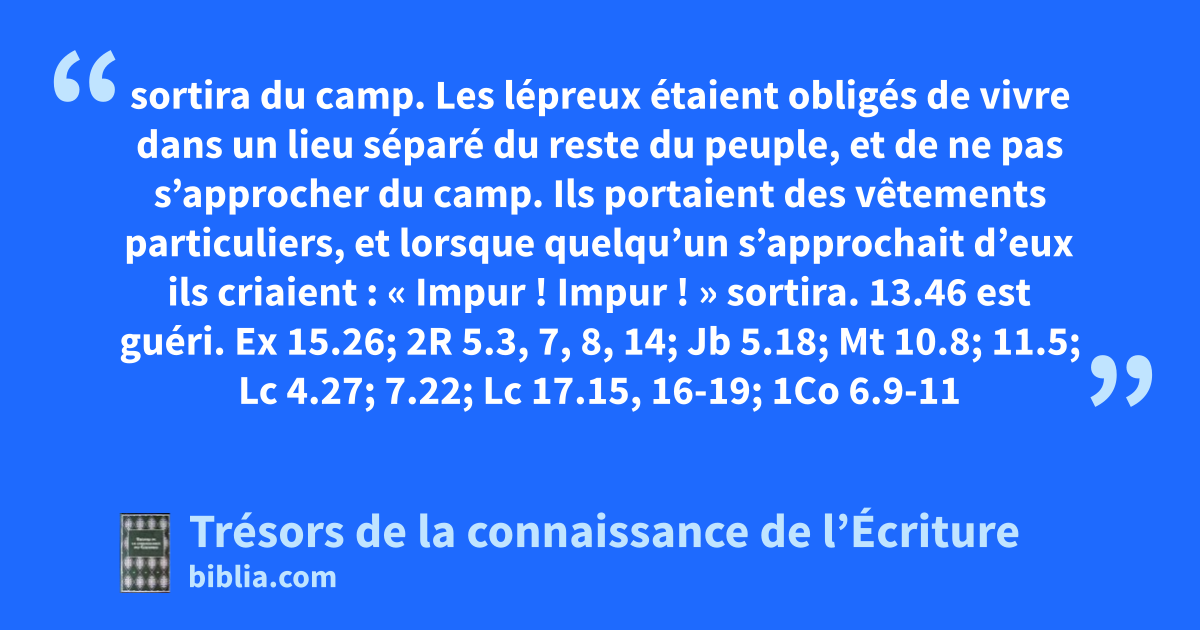 sortira du camp. Les lépreux étaient obligés de vivre dans un lieu séparé du reste du peuple, et de ne pas s’approcher du camp. Ils portaient des vêtements particuliers, et lorsque quelqu’un s’approchait d’eux ils criaient : « Impur ! Impur ! » sortira. 13.46 est guéri. Ex 15.26; 2R 5.3, 7, 8, 14; Jb 5.18; Mt 10.8; 11.5; Lc 4.27; 7.22; Lc 17.15, 16-19; 1Co 6.9-11